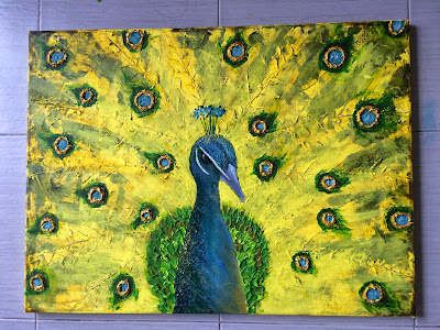 I stumbled upon an art piece of a peacock on pinterest which I thought was stunning. Unfortunately it was sold at (an exorbitant) USD2,400.00. So I decided to just paint one. And maybe sell it for half that price?